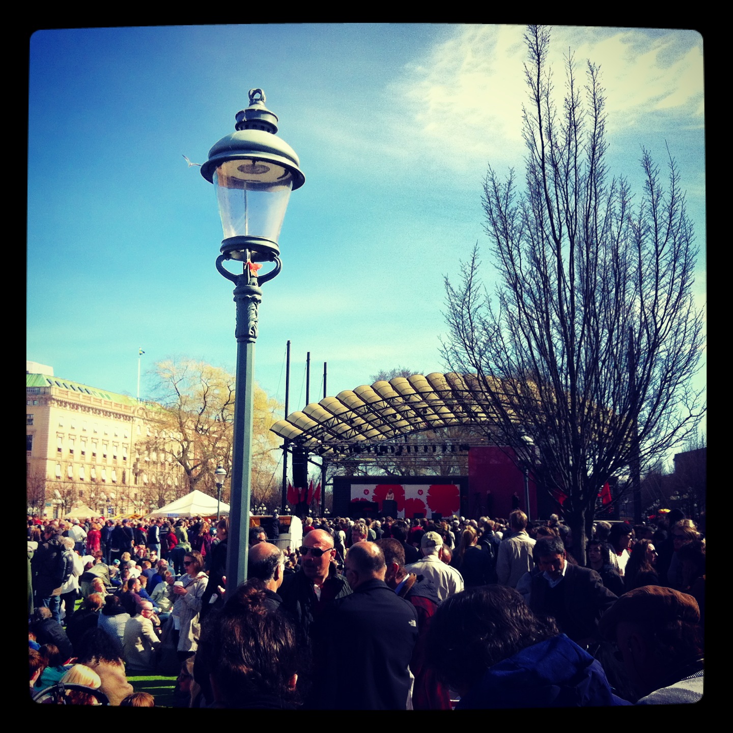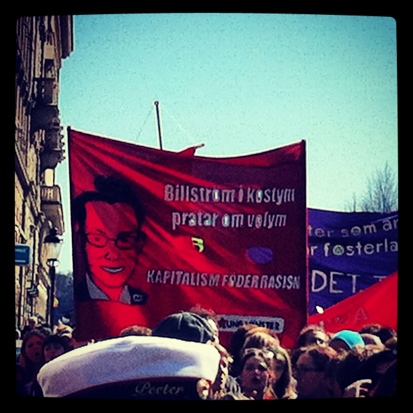 Väl framme i Kungsträdgården anslöt många fler för att lyssna på tal av Elin Melander, förbundsordförande för Vänsterns studentförbund, Johanna Granbom, distriktsordförande i Ung Vänster Storstockholm, Seluah Alsaati, ordförande för Vänsterpartiet Storstockholm och sist men inte minst Vänsterpartiets vice ordförande tillika ekonomisk-politisk talesperson; Ulla Andersson. Hon poängterade att det är arbetslösheten som är den stora frågan och att Vänsterpartiet har lösningar som kan sätta folk i arbete. Bland annat skulle Vänsterpartiets förslag om stora satsningar på välfärdssektorn ger många fler jobb åt kvinnor. Satsningar på äldrevård och barnomsorg ger också möjlighet för fler kvinnor att ta ett jobb. Seluah Alsaati höll ett bejublat tal som avslutades med en egenskriven dikt som du kan läsa här.